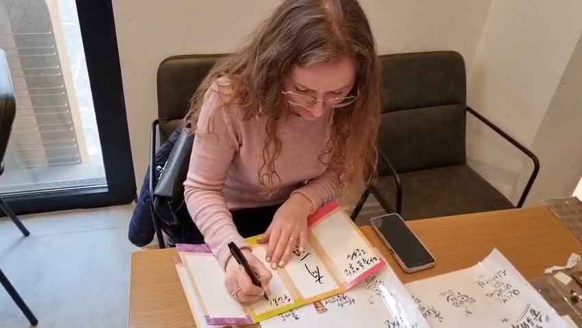 ▲ 서예 체험을 하며 한글을 적어보고 있다.